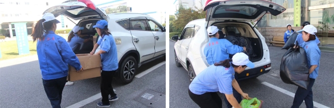 志愿者热情接待,进行清点并记录,衣物合计约562件。借用支部爱心车,将满满的爱充盈车厢。