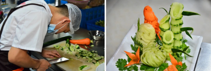 选手们准备的菜品丰富多样,各有特色。首先是几位刀工精湛的选手,将大家的视线牢牢汇聚:你相信吗?黄瓜可以成为清丽的荷叶,也可以是风雅的翠竹。一双巧手,加上非凡的创意,让一切皆有可能。