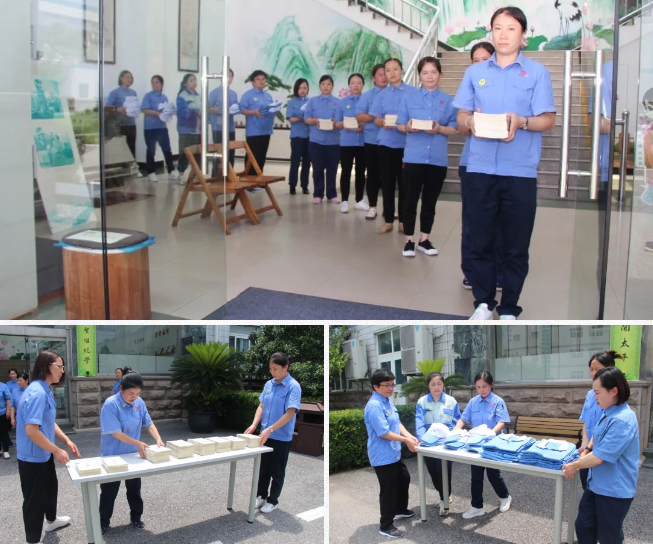 瞧,支部家人正将志工服和图书整齐有序地摊在桌子上呢!藉由正盛的阳光祛除其中的湿气,轻拿轻放的动作中,充分展现固锝人“慈心于物”的美好品德。