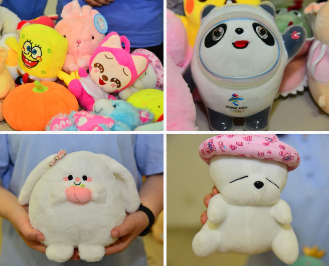 家人们带着各色各样的毛绒娃娃陆续前来捐赠,瞧,兔子、青蛙、大熊、猫咪、小狗、狐狸,可爱的小动物们越聚越多,桌子上立马成了动物园!还有许多耳熟能详的卡通形象,比如冰墩墩、宝可梦、史迪仔等。可以想象得到,当孩子们得到这些玩具时,该会有多么开心幸福!