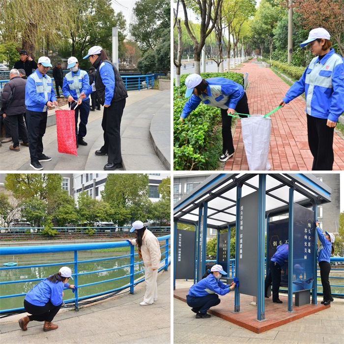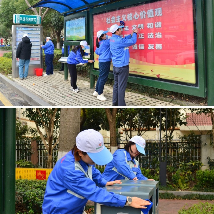 瞧!志愿者们贴心地给公交站台“洗脸”,让设施“焕然一新”。