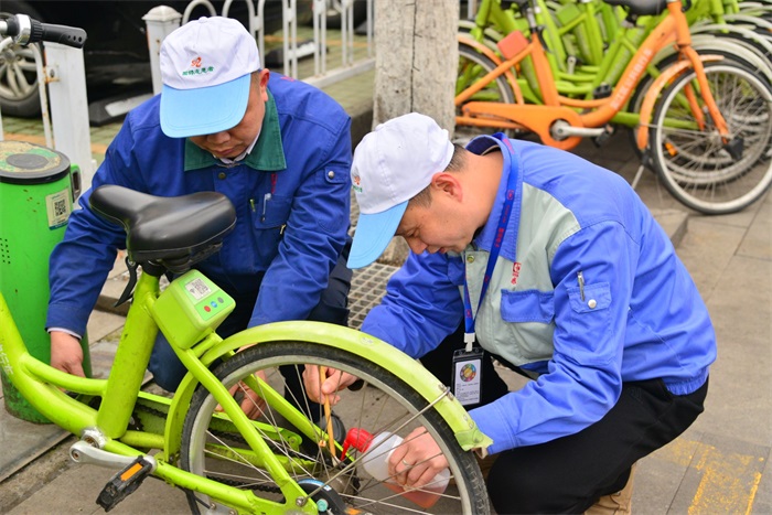 看那儿!共享单车“加油”正在活动如火如荼开展。志愿者爱的呵护让车辆延长使用寿命,更好的服务大众。固锝志愿者以文明传递温暖,以行动感染他人,带动居民一起呵护“家园”。