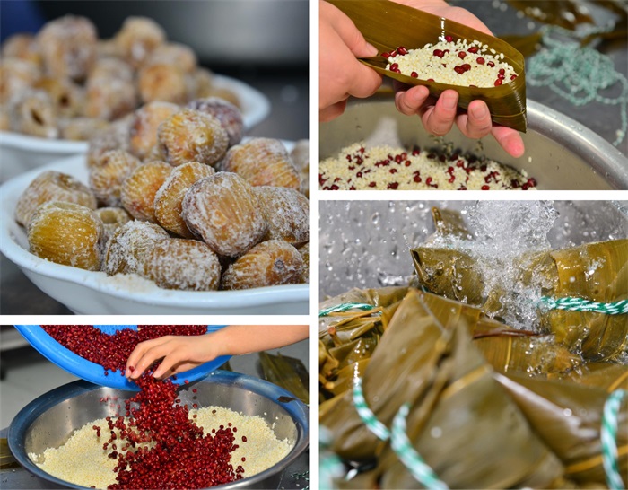 “五月五,过端午,粽叶青,糯米香”,新鲜的粽叶,搭配软滑的糯米、绵密的红豆,经过用心的准备和细致的加工,汇聚成一颗颗软糯的香粽,空气中弥漫着食材的味道,也是家的味道。