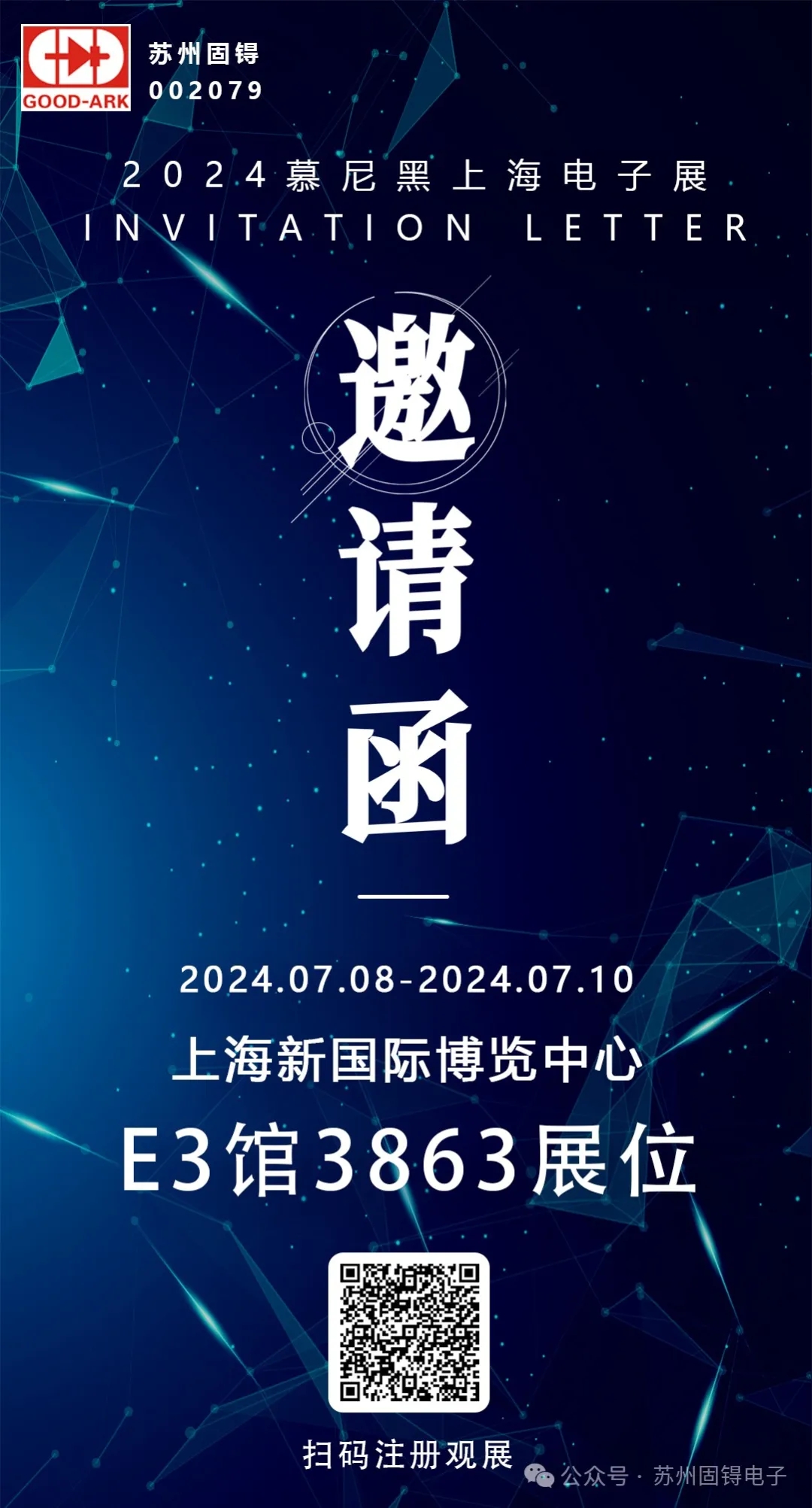 我们诚挚地邀请您参加即将于7月08日至10日在上海新国际博览中心隆重举行的2024慕尼黑上海电子展,苏州固锝将携其最新技术成果和产品亮相此次盛会,与业界同仁共襄盛举。