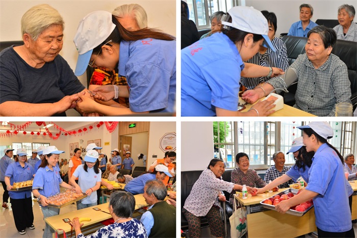 现场,“好媳妇队”的家人精心准备了美味的面包、鸡蛋和水果,让长辈在休息之余可以品尝,我们彼此陪伴,共享“幸福时光”。为长辈测量血压,修剪指甲,细微之处尽显情意,暖心关怀一样不能少!