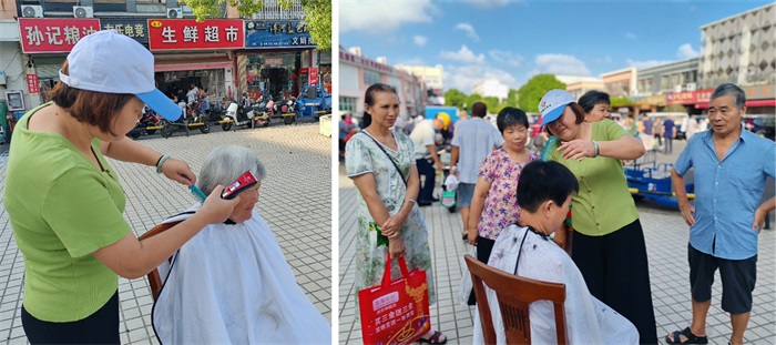 志愿者们耐心地询问每位老人的需求,为他们修剪出满意的发型,让长辈们在家门口就能享受到便捷的服务。整个摊位洋溢着浓厚的生活气息和节日的欢乐。