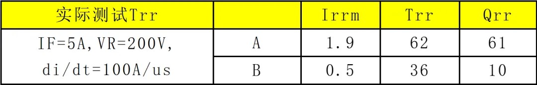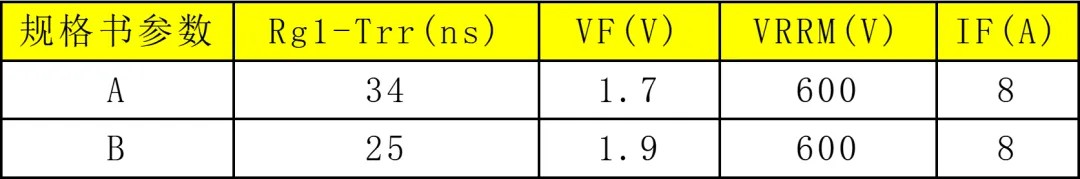 如下两颗FRD具有相同的电流电压规格,Trr差异较小,但是反向恢复损耗却相差较大,在高温条件下,差距会进一步放大, 由此带来的功耗差异也不能忽略