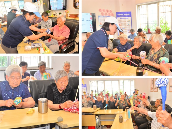 在手工 DIY 环节,桌上摆满了色彩斑斓的材料,好媳妇们耐心地指导长辈们制作简单又精美的艾草按摩锤。长辈们认真地包裹、捆扎,不一会儿,一个个充满创意的手工作品便诞生了。看着自己亲手完成的作品,长辈们眼中闪烁着自豪的光芒。这些作品不仅是他们劳动的成果,更承载着满满的成就感与幸福感,完成后,长辈们可以将这些作品带回家,留存这份美好的回忆。