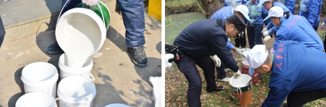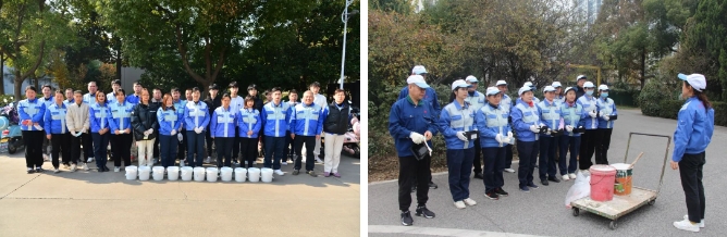 活动现场,大家分工明确,戴上手套、拿起提桶、刷子等工具,两人一组,搅拌涂料,测量高度,打圈刷树,配合默契、干劲十足。这几天虽是寒冬,却尽显温暖,刷白的幸福和快乐,传递在你我之间。沾满石灰的双手,红彤彤的脸蛋,成了亮丽的风景。